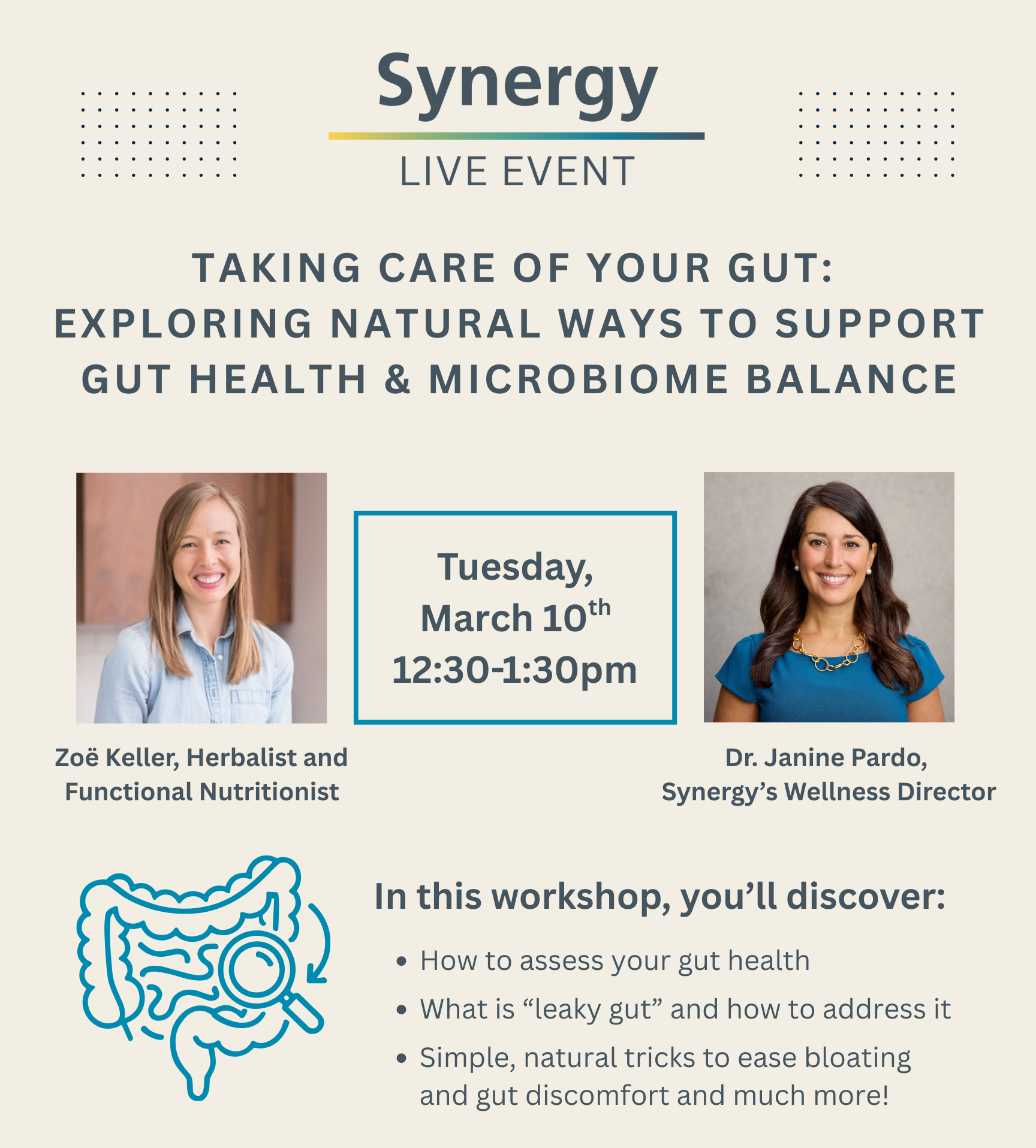 Your gut does more than digest—it influences your energy, immunity, mood, and overall well-being. Join Zoë Keller, Herbalist and Functional Nutritionist, and Dr. Janine Pardo, Synergy's Wellness Director, for an engaging and informative workshop designed to help you nourish your gut naturally, improve gut health, and restore microbiome balance.